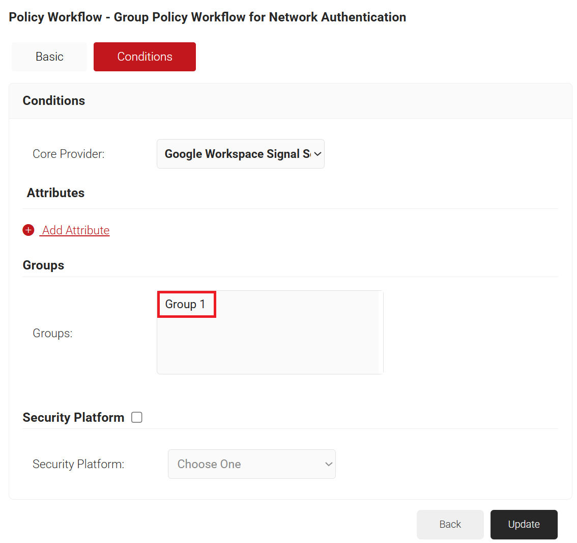 - In the Groups field, select the group you want to apply this Policy Workflow to. The group names that show up here, are the Local Groups you configured in your Signal Source.